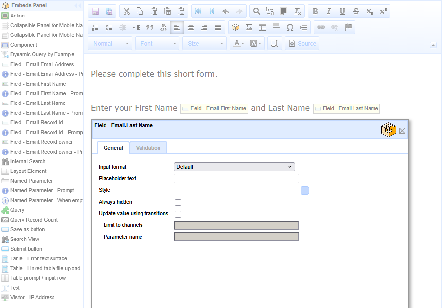You can enter text and images in the normal way using the Text Editor and embed the Table-fields and Prompts using the Embed tool in the Text Editor. Selecting the Embed tool will launch the Edit Embed-picker where you can select the embeds you want to use. You can also drag and drop Embeds from the panel on the left of the window.