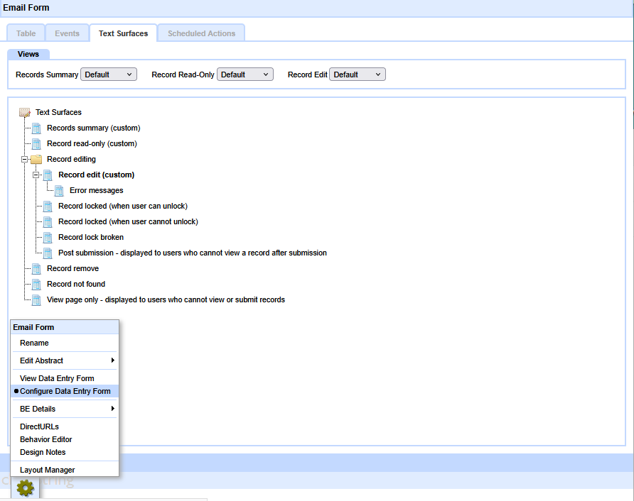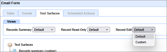 In the Configure Data Entry Form mode, select the Text Surfaces tab and change the Record Edit mode from Default to Custom.