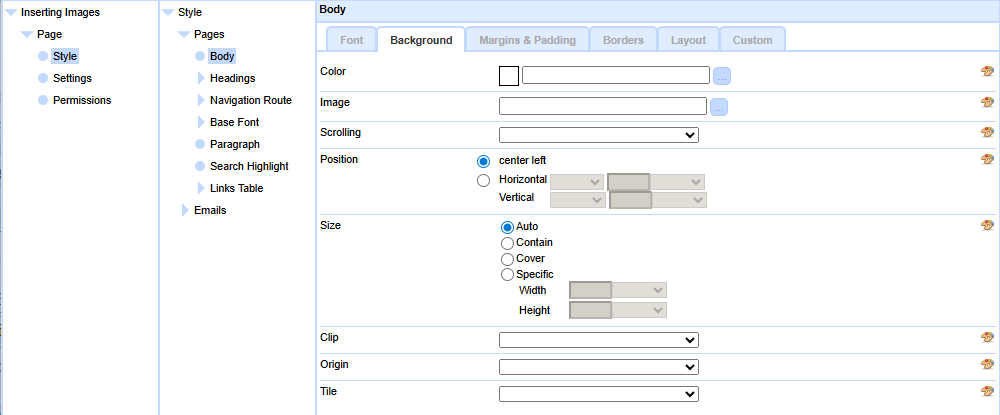 Size: Defaults to Auto but can be set to Specific. In addition you can use Contain or Cover