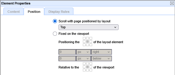 The Display Rules enable you to create sophisticated management of the Layout Elements, such as the creation of mobile friendly navigation (Read about Navigation Zones...). The Display Rules work by turning elements off or on depending on which User Group is viewing the page, the page position or the viewport width.